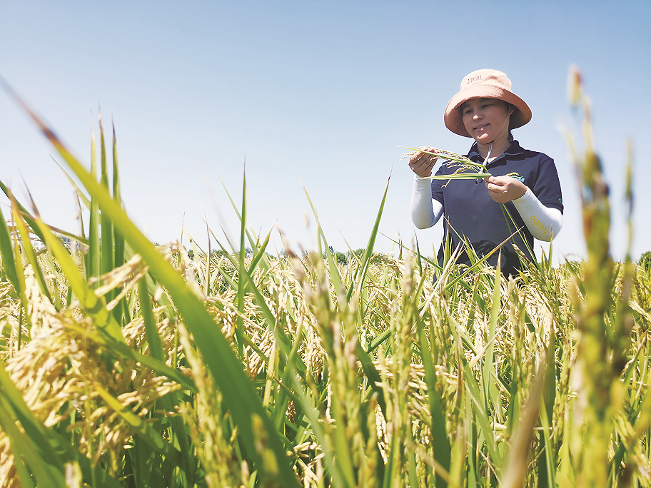 眼下正是丰收季节,位于燕山乡的海上明珠生态园内,科技特派员王士梅望着沉甸甸的稻穗,不由满面笑容——熬过了今夏极端高温干旱天气,节水型抗旱系列水稻品种迎来了丰收。